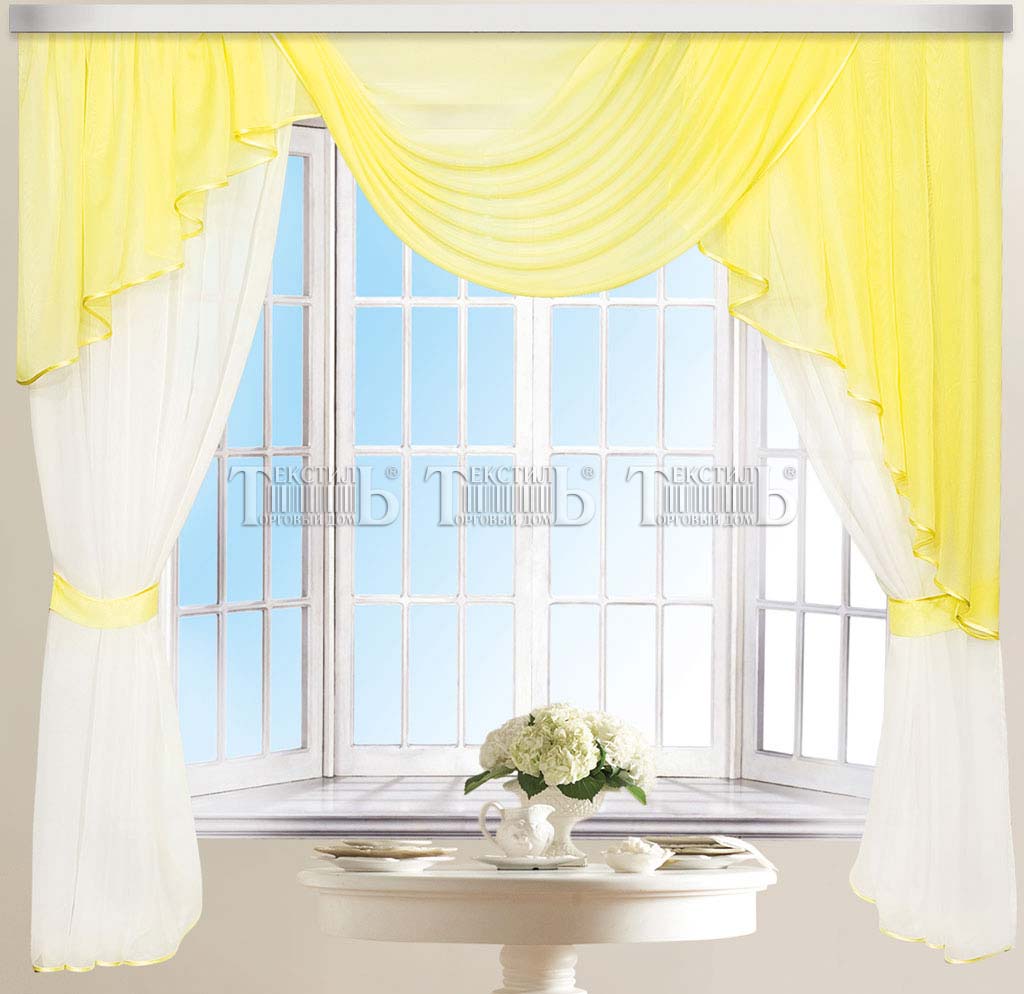 Шторы кухонные из вуали, ламбрекен-ассиметричный сваг и дежаботы из вуали. Комплект на шторной ленте под крючки. Цвета в ассортименте. Состав 100% полиэстер. Индивидуальная упаковка. Пр-во Россия