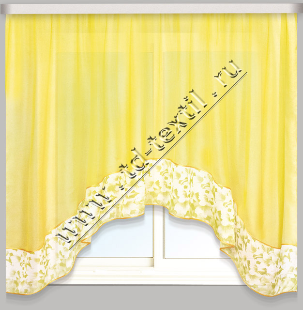 Кухонные шторы-АРКА, выполнены из однотонной вуали, а по краю оторочены воланом из вуали с печатным рисунком и косой бейкой в тон основного полотна. Крепление шторная лента (под крючки). Цвета в ассортименте. Состав 100% полиэстер. Пр-во Россия