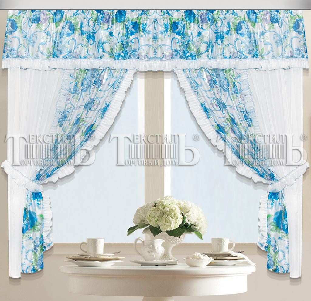 Шторы кухонные из вуали с печатным рисунком с ламбрекеном и подхватами. Комплект на шторной ленте под крючки. Цвета в ассортименте. Состав 100% полиэстер. Индивидуальная упаковка. Пр-во Россия